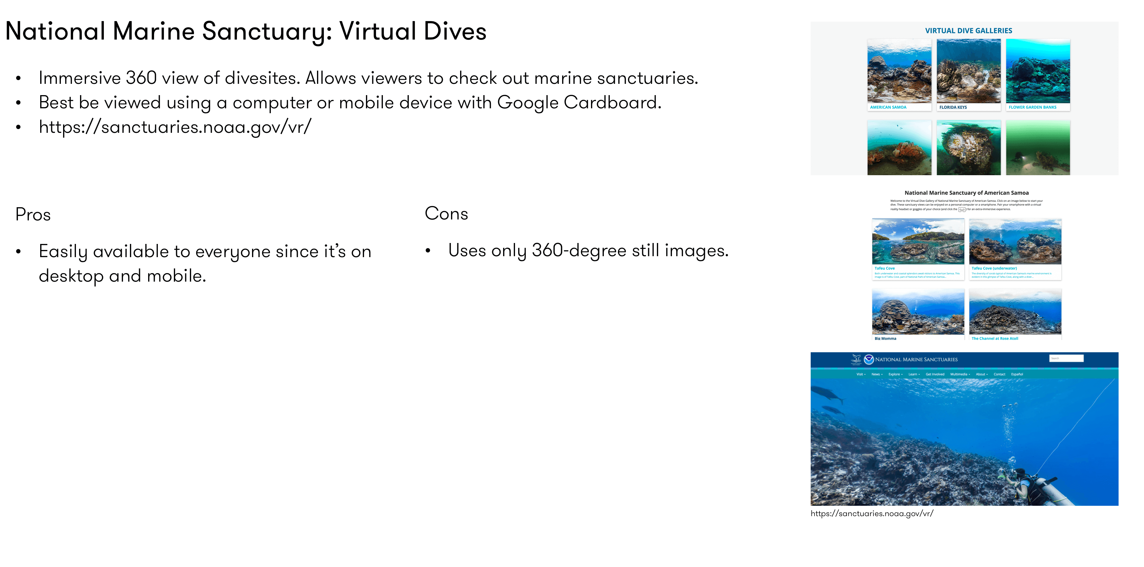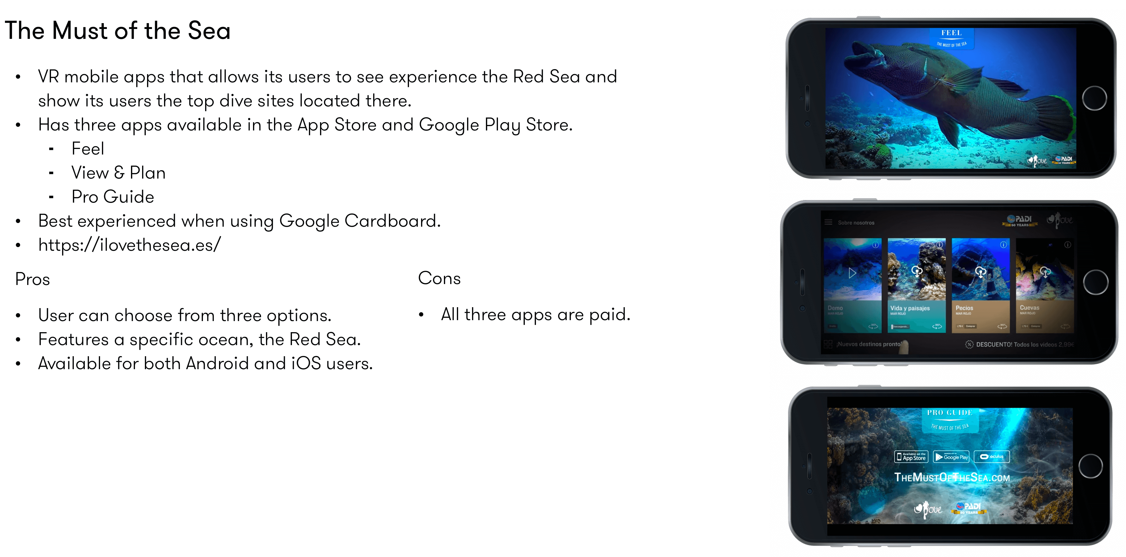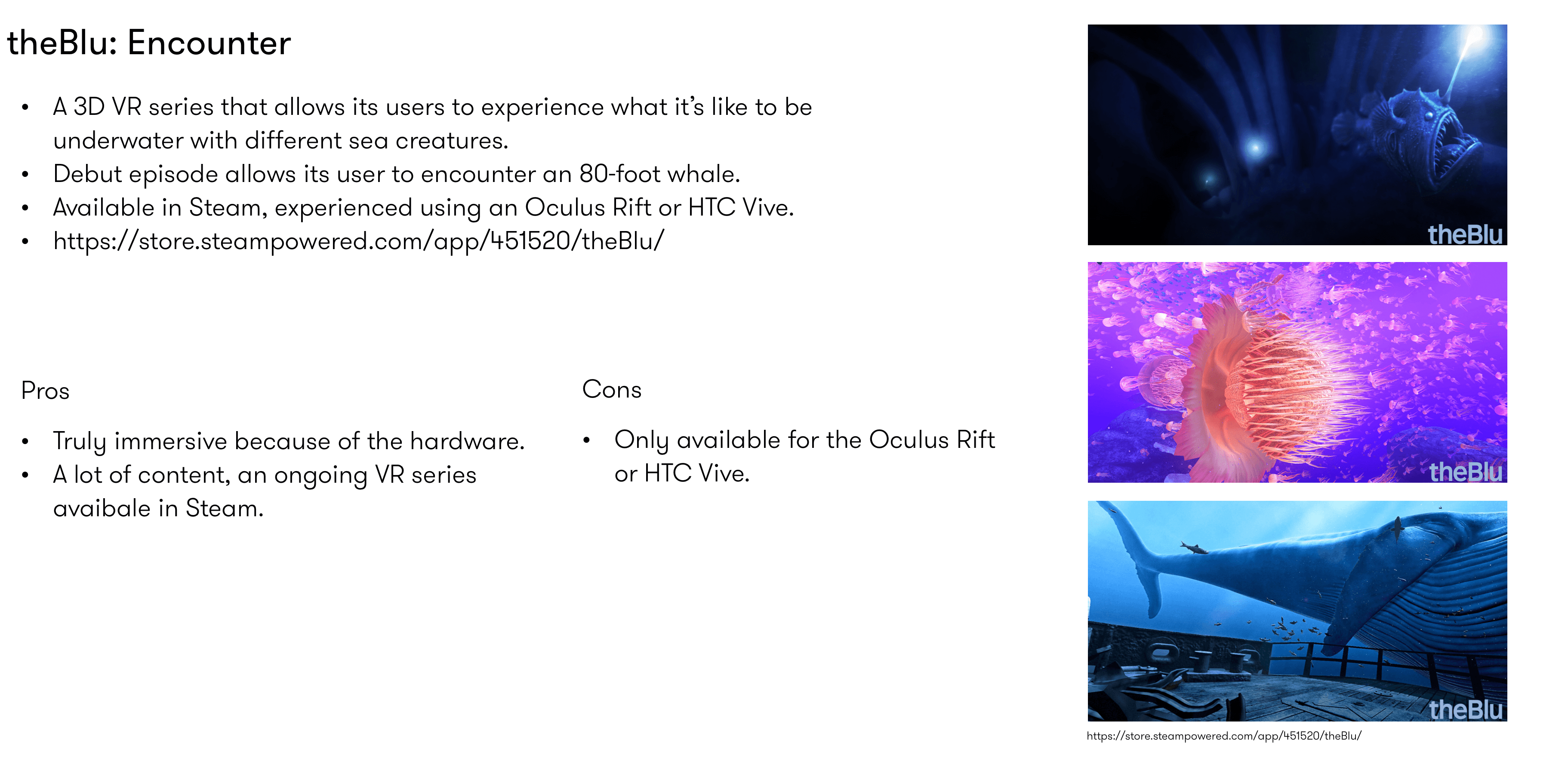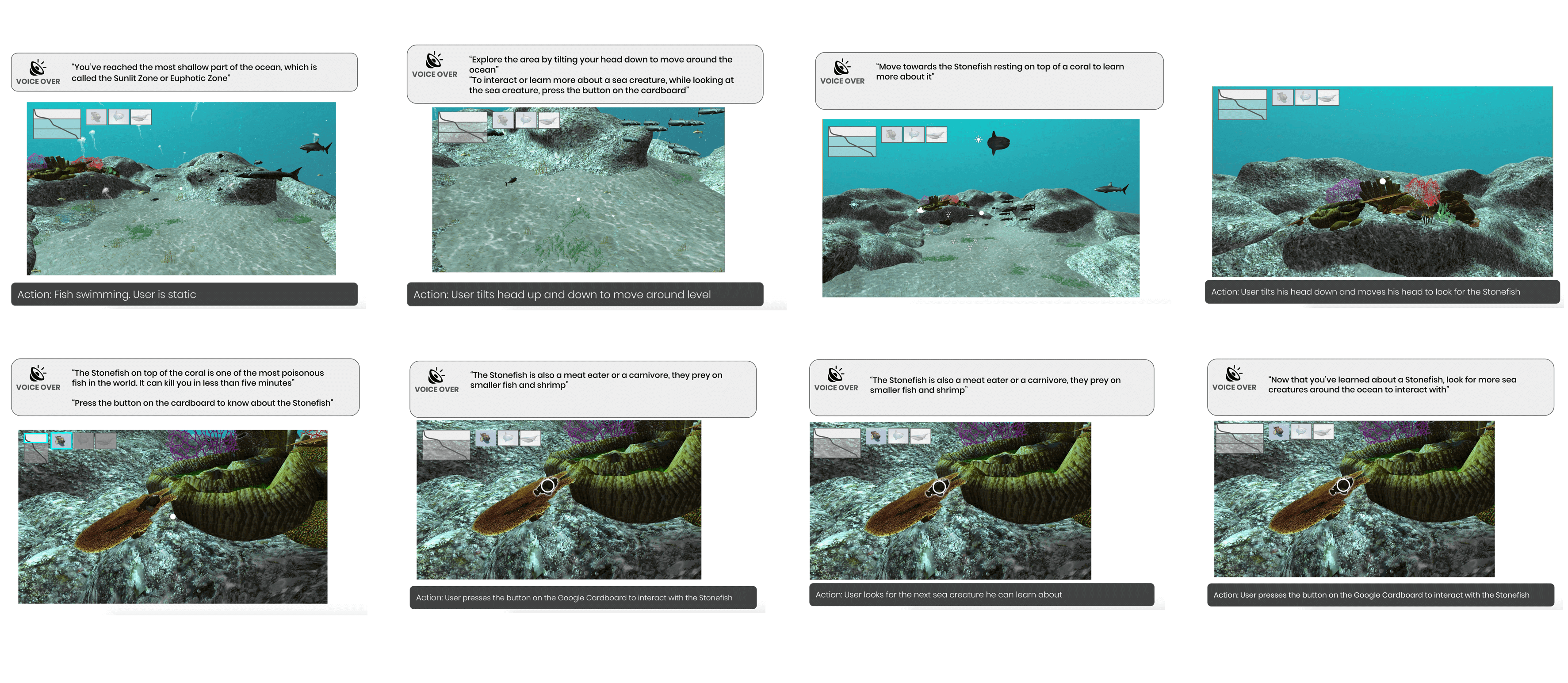 The purpose of this project is to immerse the users in an environment that isn’t familiar to them and at the same time exposing them to the different parts of the ocean. It’s also a way to show people the different kinds of sea creatures they may encounter should they decide to scuba dive in the future.