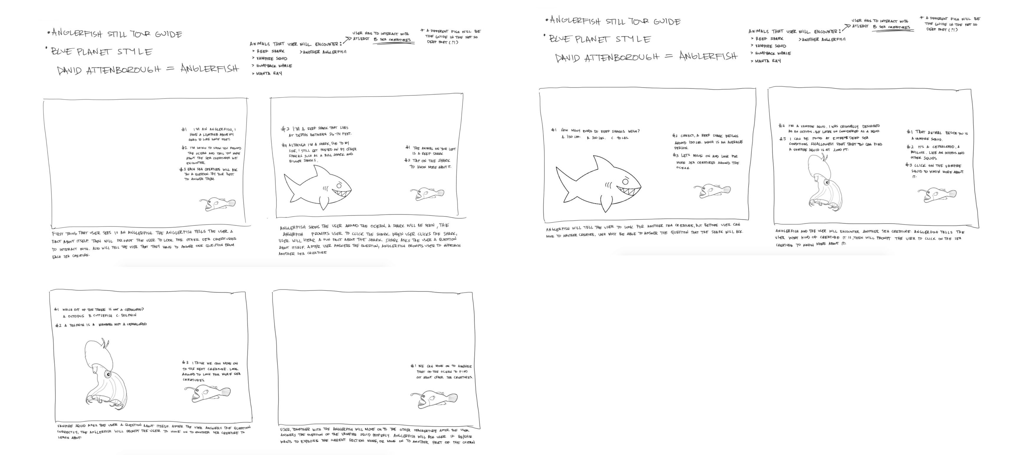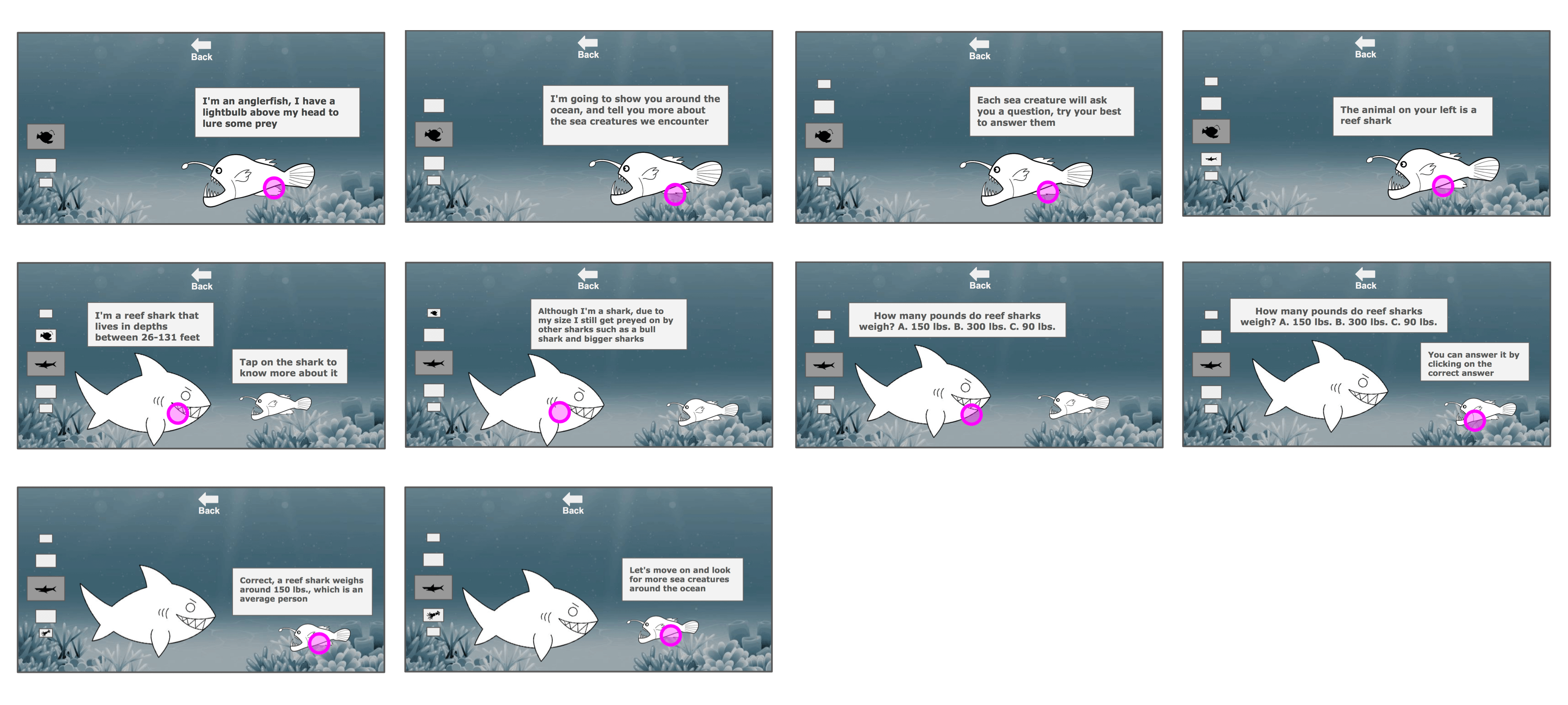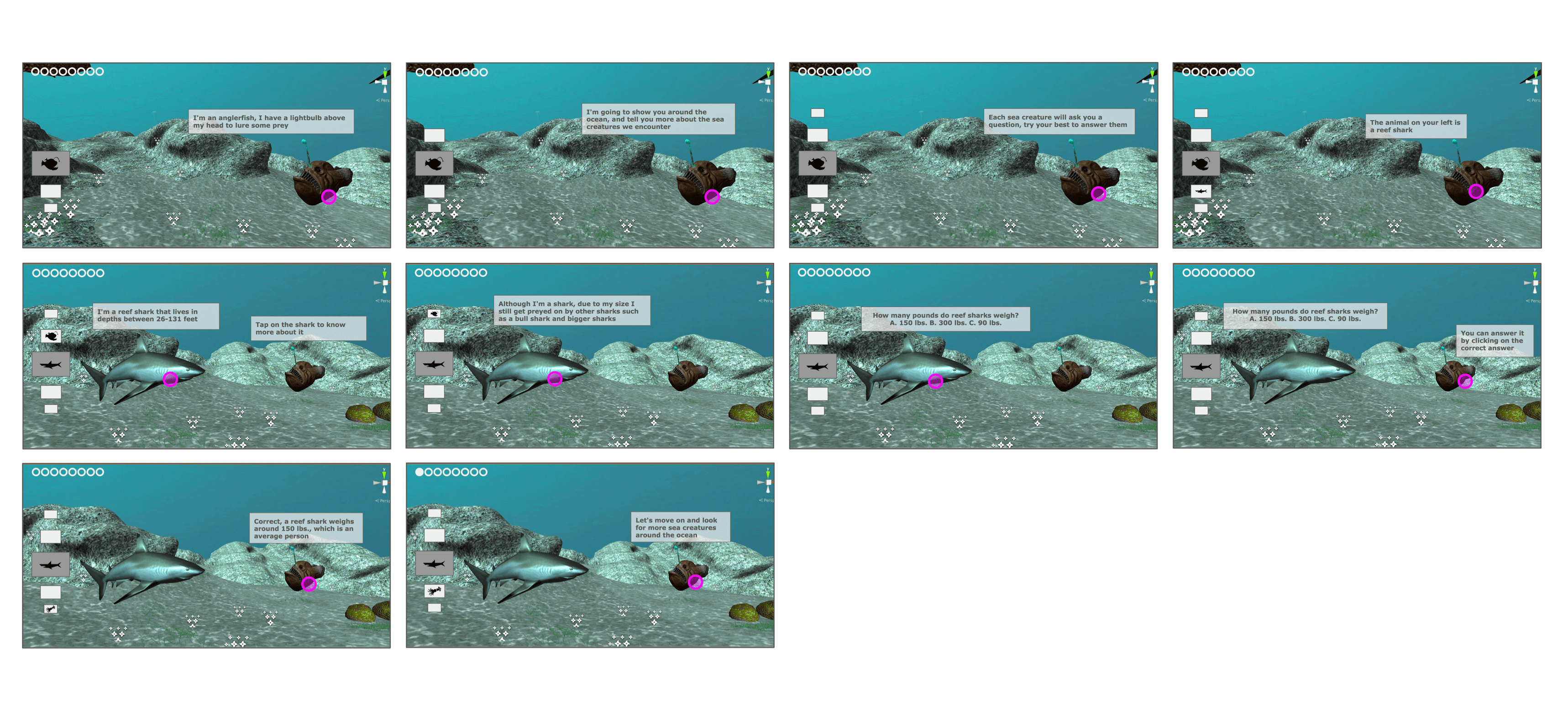The application will have three main sections, which are the levels of the ocean. Currently, there are three sea creatures that a user can interact with. Later on, I plan to add more sea creatures for each level. The three levels of the ocean are: sunlight zone, twilight zone, and midnight zone. For my thesis presentation, the sunlight zone is the most complete in terms of content.