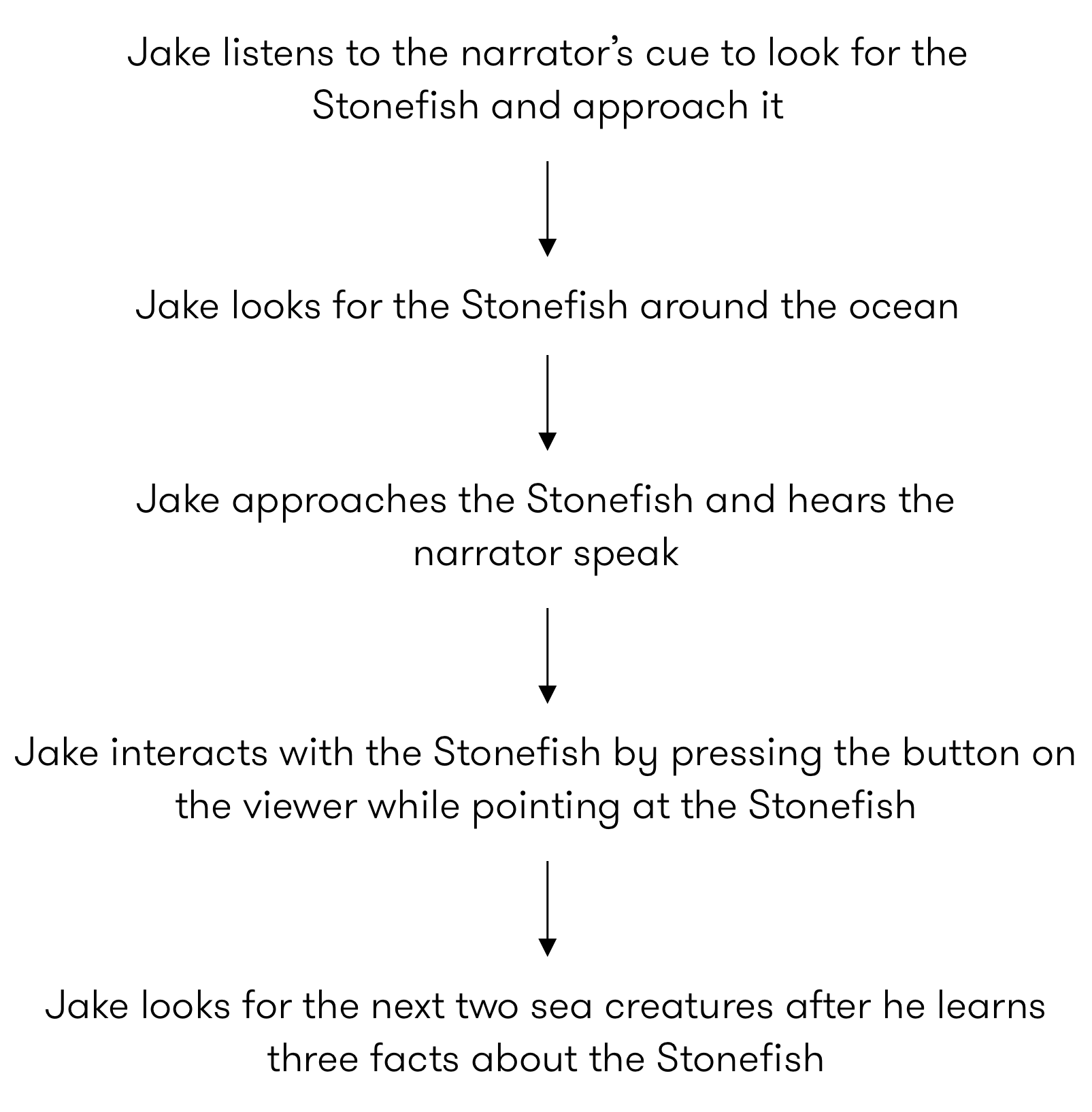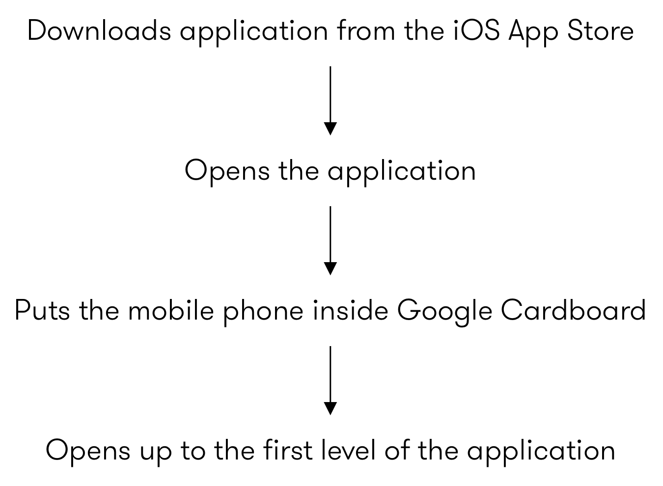 Jake downloads the app, opens the app, puts on the Google cardboard, Open the main menu, and is brought to the first level of the ocean.